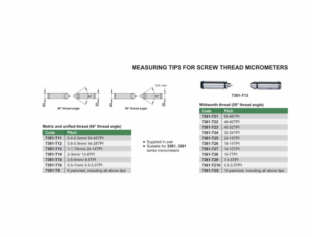 Vârfuri de măsurare cu pas 60-48 TPI pentru micrometre pentru filete Whitworth de la INSIZE.