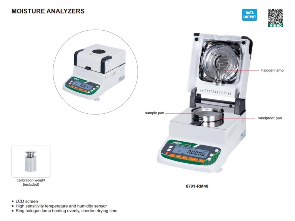 Analizor de umiditate cu o cântărire maximă de 120 g și rezoluție de 0,1 mg de la INSIZE. Cu senzor de temperatură și umiditate cu sensibilitate ridicată. Lampa cu halogen rotund se încălzește uniform, scurtând timpul de uscare.