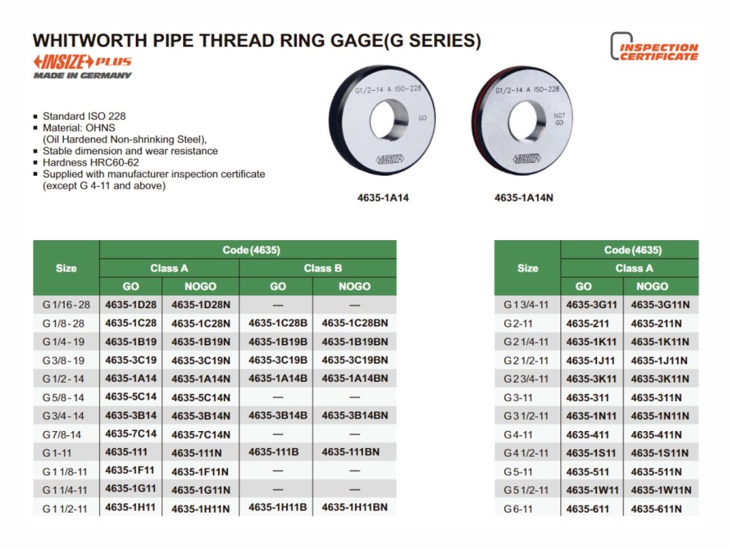 Calibru inel filetat de la Insize, tip Nu trece, clasă de toleranță A, tip filet G.