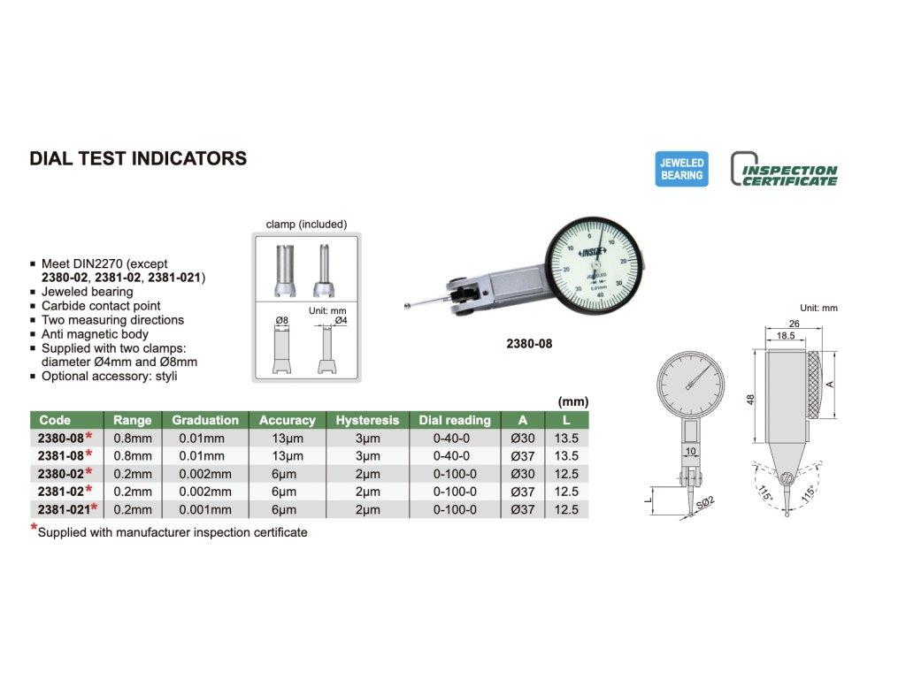 Ceas comparator antimagnetic cu levier de la INSIZE, interval 0,2 mm, rezoluție 0,001 mm, palpator din carbură, pini de prindere.
