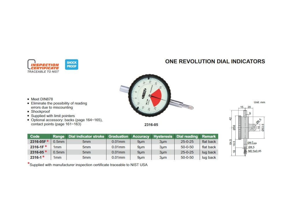 Ceas comparator cu o singură rotație 0,5/0,01 mm, carcasă spate plată INSIZE