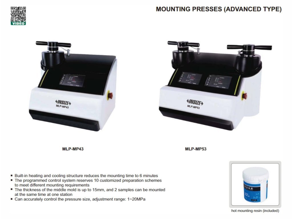 Presa metalografică de montaj MLP-MP43 (model avansat) de la INSIZE funcționează în intervalul de temperatură între 90 până în 200 °C. Este prevăzută cu răcire automată cu apă, ceea ce reduce timpul total de pregătire a probelor la 6 minute. Cu posibilitate de introducere a două probe în același timp. De asemenea, oferă setare de presiune între 1-20 MPa și un sistem de control, care permite stocarea până la 10 procese presetate, pentru a elimina erorile de configurare.