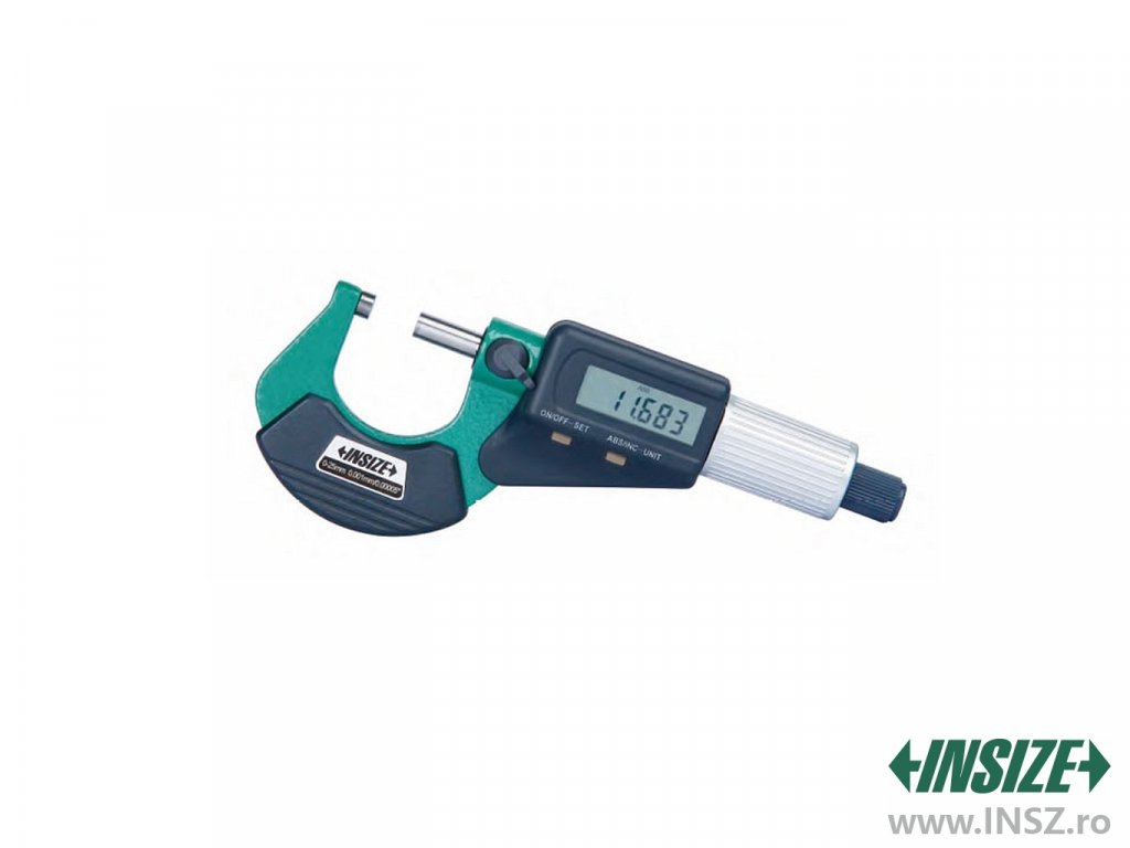 Micrometru digital de exterior de la Insize, cu interval 0-25 mm și rezoluție de 0,001 mm. Suprafețe de măsurare din carbid, cu șurub de blocare și clichet.