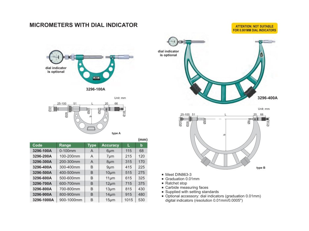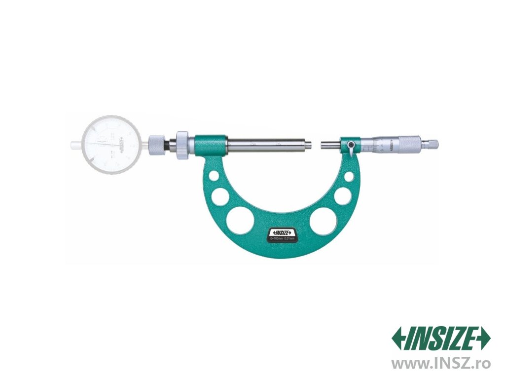 Micrometru mecanic de exterior de la Insize, cu interval 100-200 mm și gradație 0,01 mm, cu posibilitate de conectare ceas comparator mecanic sau digital cu rezoluție 0,01 mm.