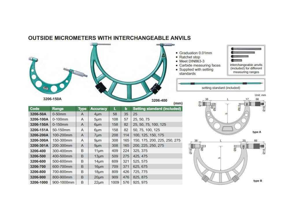 Micrometru mecanic de exterior 400-500/0,01 mm cu nicovale interschimbabile, tip B INSIZE