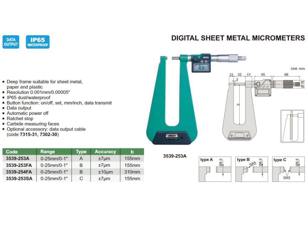Micrometru digital pentru măsurarea grosimii tablei 0-25/0,001 mm/7 µm, typ A INSIZE