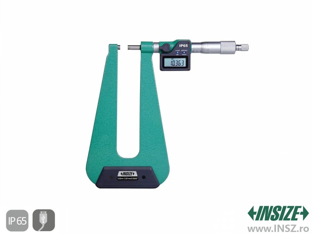 Micrometru digital universal de la Insize, cu interval 0-25 mm și rezoluție 0,001 mm, cu cadru adânc. Pentru măsurarea grosimii tablei, hârtiei și plasticului. Tip A - cu ambele nicovale plate.
