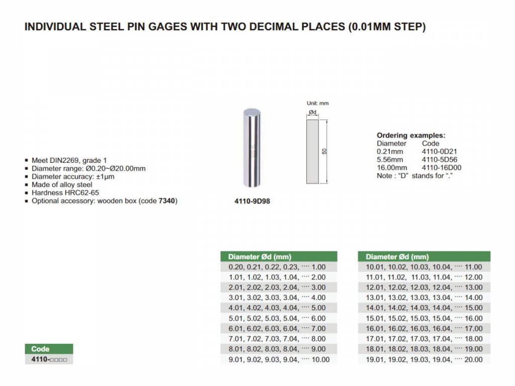 Pin cilindric de măsurare din oțel 13,98 mm, 4110-13D98 INSIZE