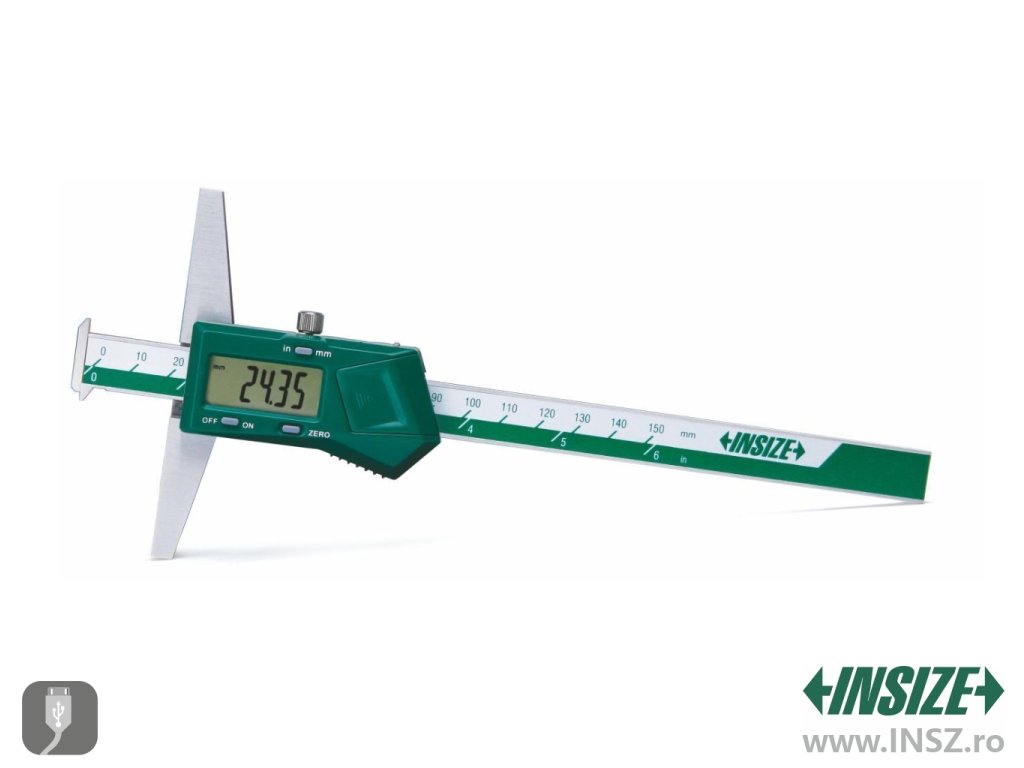 Șubler digital de adâncime cu cârlig dublu de la INSIZE cu interval de măsurare 0-1000 mm și rezoluție 0,01 mm. Lungimea bazei este de 200 mm. Cu ieșire de date prin interfață USB, corespunde standardului DIN862.