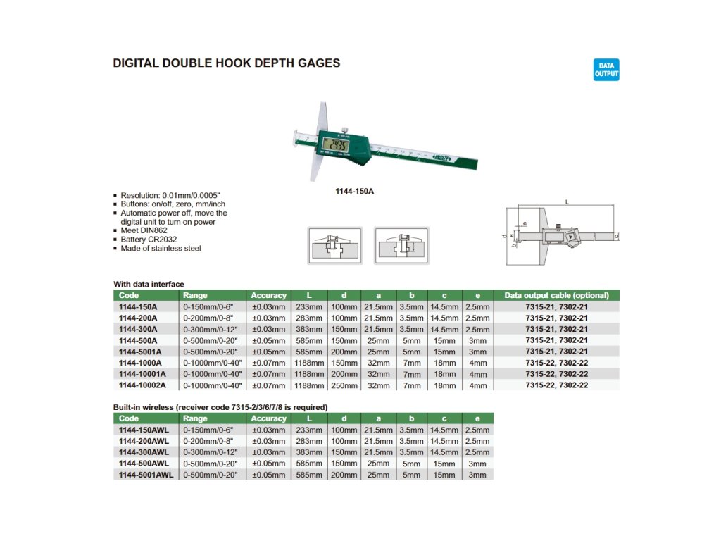 Șubler digital de adâncime cu cârlig dublu de la INSIZE cu interval de măsurare 0-300 mm și rezoluție 0,01 mm. Lungimea bazei este de 150 mm. Cu ieșire de date prin sistem wireless integrat, corespunde standardului DIN862.