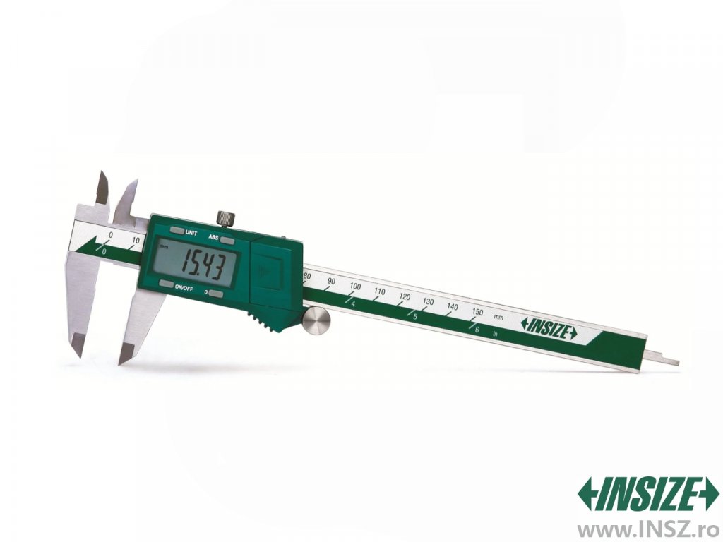 Șubler digital de la Insize, cu interval de măsurare 0-200 mm și rezoluție 0,01 mm. Lungimea ciocurilor inferioare este de 50 mm, cu rolă de avans, port ieșire date și tijă plată pentru măsurarea adâncimilor.