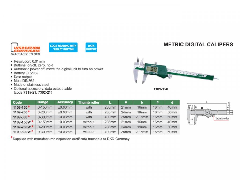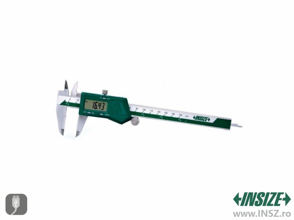Șubler digital cu funcția HOLD, cu interval 0-150 mm și rezoluție 0,01 mm de la INSIZE. Lungimea ciocurilor inferioare este de 40 mm, cu port ieșire date, tijă pentru măsurarea adâncimii și rolă de avans.
