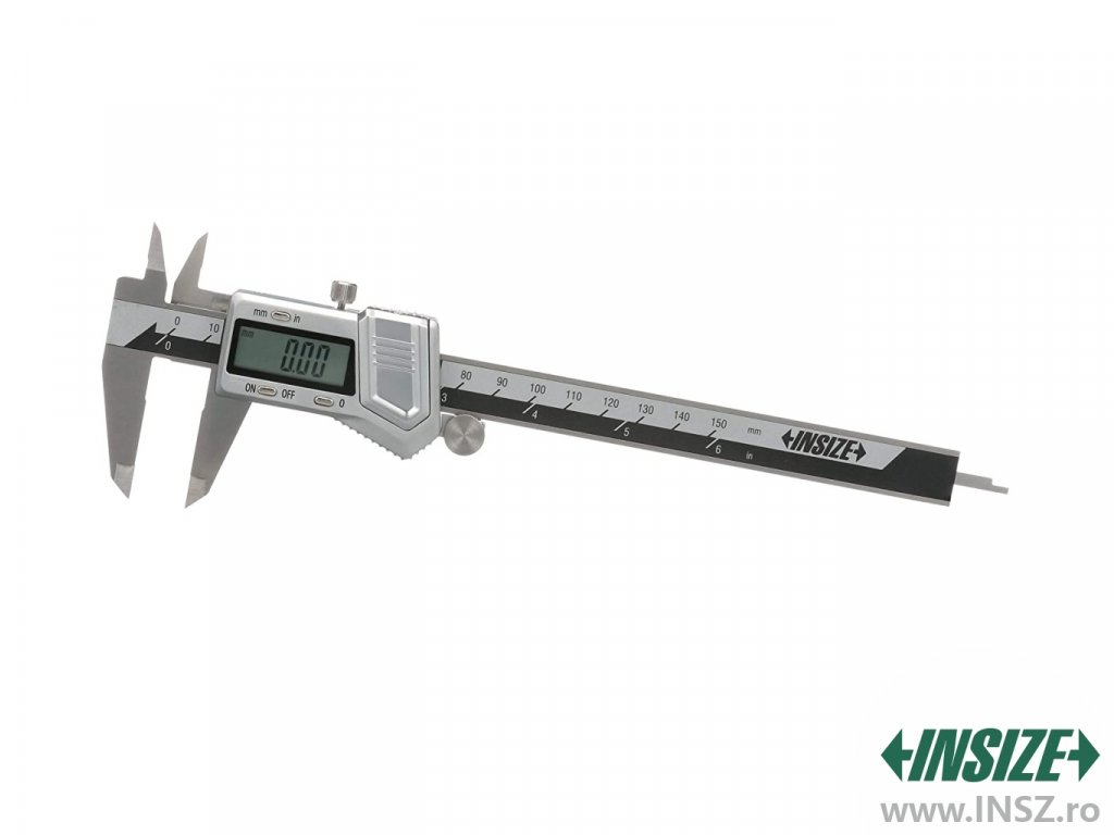 Șubler digital din oțel inoxidabil și cu carcasă din aliaj de zinc, cu interval de măsurare 0-200 mm și rezoluție 0,01 mm de la INSIZE. Lungimea ciocurilor inferioare este de 50 mm, cu tijă pentru măsurarea adâncimilor și rolă de avans.