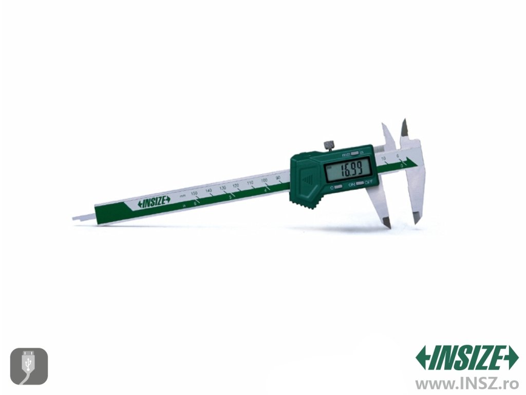 Șubler pentru utilizare cu mâna stângă, cu interval 0-300 mm și rezoluție 0,01 mm de la INSIZE, cu cadran digital pe partea opusă. Lungimea ciocurilor inferioare este de 60 mm, cu tijă pentru măsurarea adâncimii și port ieșire date.