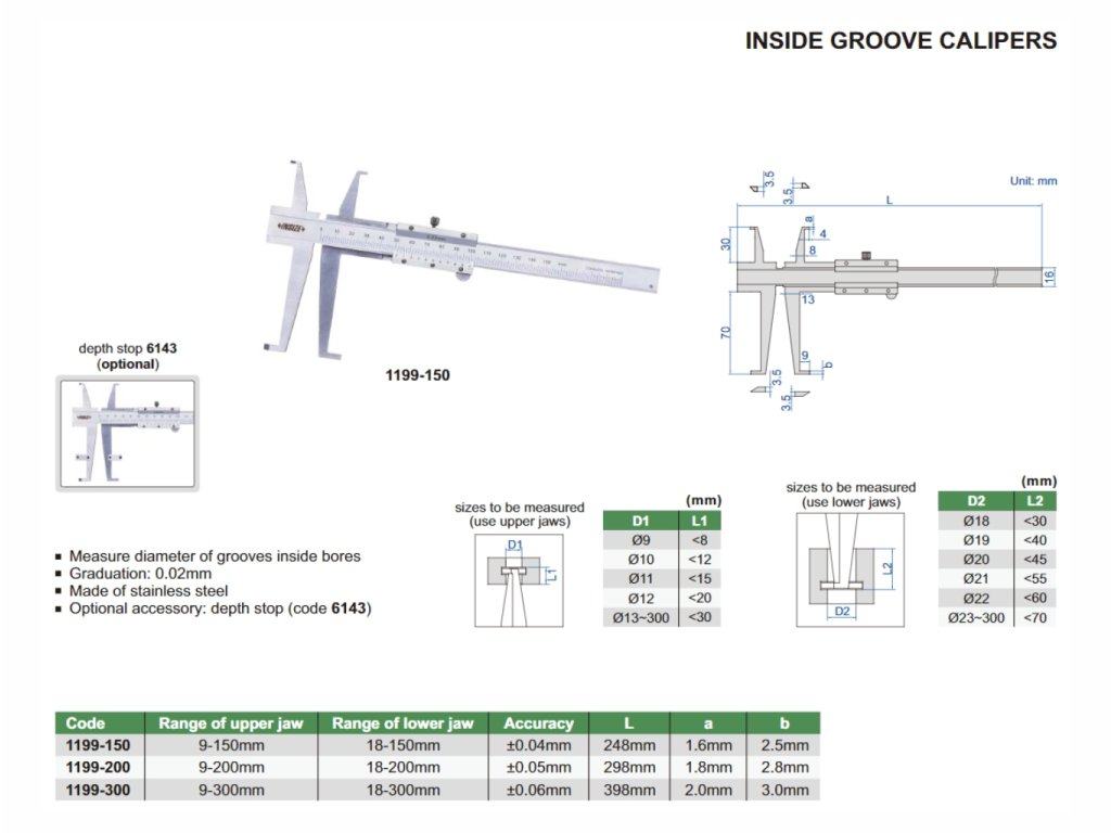 Șubler mecanic cu interval 9-200/0,02 mm de la INSIZE cu ciocuri superioare cu lungime de 30 mm și ciocuri inferioare cu lungime de 70 pentru măsurarea canelurilor.