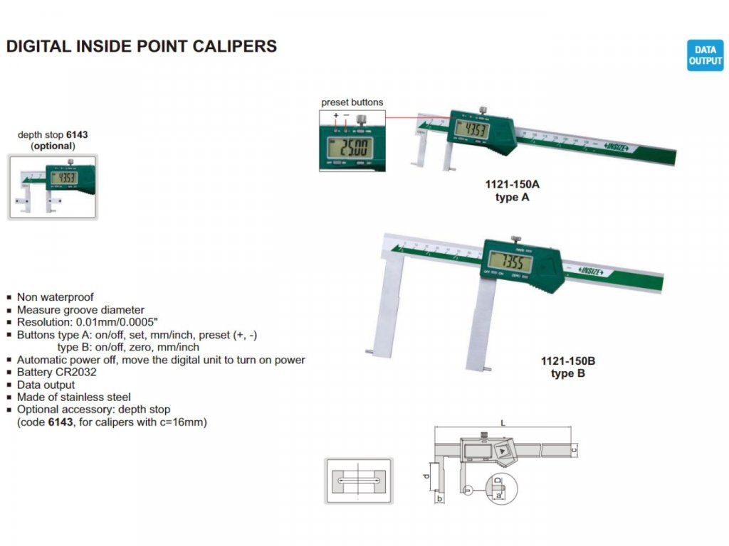 Șubler digital cu interval 40-200/0,01 mm de la INSIZE cu ciocuri inferioare spre exterior pentru măsurarea canelurilor interioare, cu port ieșire date.